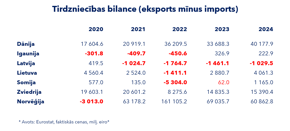 “Iekšzemes kopprodukts veidojas no valsts + privātā patēriņa + eksports - imports, tāpēc būtisks ir ievesto preču apjoms naudas izteiksmē, un atkal, salīdzinot Baltijas un Skandināvijas valstis, jāsecina, ka Latvija ir vienīgā ar negatīvu tirdzniecības bilanci, kur importa vērtība pārsniedz eksporta ienākumus,” uzsver R. Kakānis. Viņš vērš uzmanību uz Eurostat datiem, kuri rāda: 2024. gadā Latvijai imports pārsniedza eksportu par vairāk nekā vienu miljardu eiro, kamēr Igaunijai eksporta ienākumi pārsniedza importu par teju 223 miljoniem eiro, bet Lietuvai – pat par vairāk nekā 4 miljardiem eiro. “Faktiski negatīva tirdzniecības bilance nozīmē, ka Latvija ilgstoši turpina samazināt savu kopproduktu – kļūstam nabagāki,” tā R. Kakānis. Viņaprāt, nevietā ir atrunas par to, ka Latvijai nav tādu derīgo izrakteņu kā nafta un dabasgāze, jo tādu nav arī Igaunijai un Lietuvai. “Dānijai, kurai nav ne tādu mežu resursu, kādi ir Latvijai, nedz arī energoresursu, kādi ir Norvēģijai, eksporta ienākumi pārsniedz importa tēriņus par 40 miljardiem eiro,” tā R. Kakānis. Viņš atzīst, ka 2022. gads ar strauju cenu pieaugumu visam būtībā radīja situāciju, kurā importa tēriņi pārsniedza eksporta ienākumus gan Igaunijai, gan Latvijai, gan Lietuvai, gan Somijai, taču pārējās valstis spēja tirdzniecības saldo padarīt pozitīvu atšķirībā no Latvijas.
