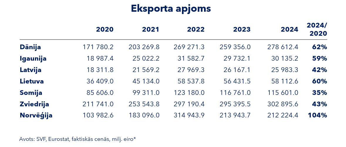 Pētnieki aicina palūkoties uz kopējiem eksporta ienākumiem un izdarīt secinājumus par tā pieauguma lielumu 2024. gadā pret 2020. gada rezultātu. “Ja 2020. gadā Latvijas un Igaunijas eksporta ienākumu apmērs bija ļoti līdzīgs – 18,99 miljardi eiro Igaunijai un 18,31 miljards eiro Latvijai, tad 2024. gadā Igaunijai tas bija jau 30,14 miljardi eiro, bet Latvijai – 25,98 miljardi eiro, savukārt Lietuva no 36,41 miljarda eiro jau ir pieaugusi uz 58,11 miljardiem eiro, tas nozīmē, ka Latvijas eksporta ienākumu (ieskaitot inflācijas efektu) izaugsmes temps ir 42%, Igaunijas – 59%, bet Lietuvas – 60%,” skaidro R. Kakānis. Viņš salīdzinājumam rāda Dānijas eksporta ienākumu pieaugumu – 62%, Norvēģijas – 104%. “Jā, Zviedrijas eksporta ienākumu pieauguma temps 2024. gadā salīdzinājumā ar 2020. gadu ir 43%, tas ir tikpat, cik Latvijai, taču ciparu izteiksmē tas nav salīdzināms, jo pieaugums ir vairāk nekā 100 milj. eiro apmērā, kamēr Latvijai – tikai nepilni 8 miljardi eiro. Protams, vēl lēnāk augusi ir Somija – tikai 35%, taču naudas izteiksmē tas ir teju 30 miljardi eiro,” uzsver R. Kakānis. Viņa ieskatā šie dati tikai liek uzdot jautājumus, kas ir darīts līdz 2020. gadam Latvijā un ko un kā darījušas ir kaimiņvalstis, un vēl jo vairāk Covid-19 pandēmijas laikā un pēc tam. “Faktiski Latvijas atpalicība 2020. gadā no Igaunijas bija tikai ap 0,6 miljardiem eiro, bet četru gadu laikā pieauga līdz 4 miljardiem, no Lietuvas atpalicība sasniedza pat 33 miljardus eiro,” nepielūdzamo statistikas verdiktu rāda R. Kakānis. Viņam arī rodas jautājums, vai Latvija ar savu līdzšinējo pieeju vispār spēs vēl kādu valsti noķert un aizsniegties līdz ES vidējiem rādītājiem.