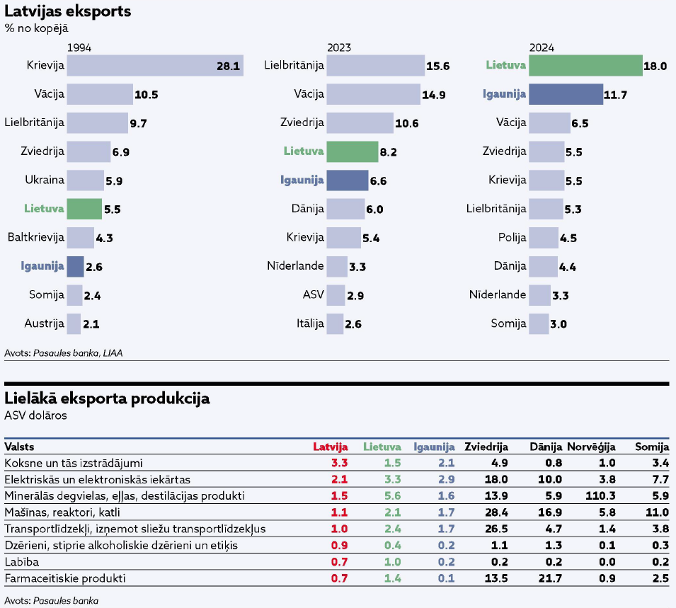 “2,1 miljardu ASV dolāru lielus ienākumus 2024. gadā Latvijai ienesa elektrisko un elektronisko aparātu eksports. Tā ir Latvijai otra lielākā eksporta ienākumu pienesēja, taču Igaunijai šī pati nozare atnesa 2,9 miljardus, Lietuvai – 3,3 miljardus, Norvēģijai – 3,8 miljardus, Somijai – 7,7 miljardus, Dānijai – 10 miljardus, bet Zviedrijai pat 18 miljardus ASV dolāru ienākumu,” analizē R. Kakānis. Viņš uzsver, ka arī Latvijas trešās eksporta produktu ģenerējošās nozares – minerālās degvielas, eļļas, destilācijas produktu ražošanas – pienesums 1,5 miljardu ASV dolāru apmērā tai nedod līdera godu pat Baltijā, jo Lietuvai šī nozare deva 5,6 miljardus ASV dolāru, bet Igaunijai – 1,6 miljardus ASV dolāru.
