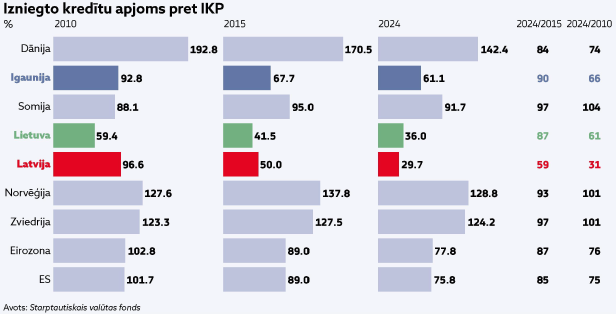“Privātā sektora kredītu apjoms pret IKP 2010. gadā Latvijai bija 96,6%, Igaunijai – 92,8%, Lietuvai – 59,4%, savukārt 2024. gadā Latvijai – 29,7%, Igaunijai – 61,1%, Lietuvai – 36%, salīdzinājumam Zviedrijā tas ir ap 125%, eirozonas valstīs – ap 77–78%, Eiropas Savienības dalībvalstīs – ap 75–76%. “Aina ir tāda, it kā Latvijā privātais sektors būtu turēts finanšu badā, lai nebūtu attīstības vai arī tā būtu ļoti lēna, kā rezultātā arī nav tādu investīciju, nav tādu jaunu ražotņu un tādu produktu, kādus Latvija varētu ražot un eksportēt,” tā R. Kakānis. Viņš atzīst, ka 2025. gadā ir redzams progress, jo privātajam sektoram, rezidentiem izsniegto kredītu apjoms kopumā šogad palielinājies par aptuveni 600 miljoniem eiro. “Cerams, ka šis izsniegto kredītu apjoma pieaugums turpināsies arī 2026. un tam sekojošajos gados, kas, savukārt, ilgtermiņā radīs pozitīvu ietekmi uz Latvijas tautsaimniecību,” steidz piebilst R. Kakānis. Viņaprāt, jautājums attiecībā par kreditēšanu Latvijā jau prasa papildu analīzi, taču problēmas saknes nav meklējamas finanšu resursos, jo klientu (uzņēmumu un iedzīvotāju) naudas apjoms komercbankās pārsniedz izsniegto kredītu apmēru 2024. gada nogalē par 6,7 miljardiem eiro. “Lai arī Lietuvā ir būtiski lielāks izsniegto kredītu apjoms nekā Latvijā, tomēr arī dienvidu kaimiņvalstī klientu kontos un depozītos esošās naudas apjoms pārsniedz izsniegto kredītu apjomu par 12 miljardiem eiro. Savukārt rezidentu naudas apjoms kontos un noguldījumos bankās Latvijā ir 20, bet Lietuvā – 44 miljardi eiro. Ņemot vērā iedzīvotāju skaita atšķirības, vidējais latvietis ir vismaz pusotru reizi nabadzīgāks par vidējo lietuvieti,” tā R. Kakānis.