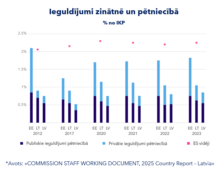 Pētnieki secinājuši, ka būtībā pēdējo gadu laikā neviena no Baltijas valstīm nav spējusi veikt ieguldījumus zinātnē un pētniecībā tādā apmērā, kā tas bija vidēji ES. “Tikai Igaunija tālajā 2012. gadā spēja sasniegt un pat pārsniegt vidējo ES ieguldījumu procentu pret IKP, savukārt Latvijai tajā laikā bija tikai 0,5%, bet tā arī nav izdevies sasniegt pat 1% līmeni, kamēr kaimiņvalstis regulāri pārsniedza 1% atzīmi,” skarbi secina R. Kakānis. Viņš gan norāda vēl uz kādu interesantu faktu, proti, Latvijā vislielāko devumu zinātnē un pētniecībā nodrošina publiskais sektors, kamēr Igaunijā – privātas kompānijas, tieši tāpat kā vairumā pasaules valstu.